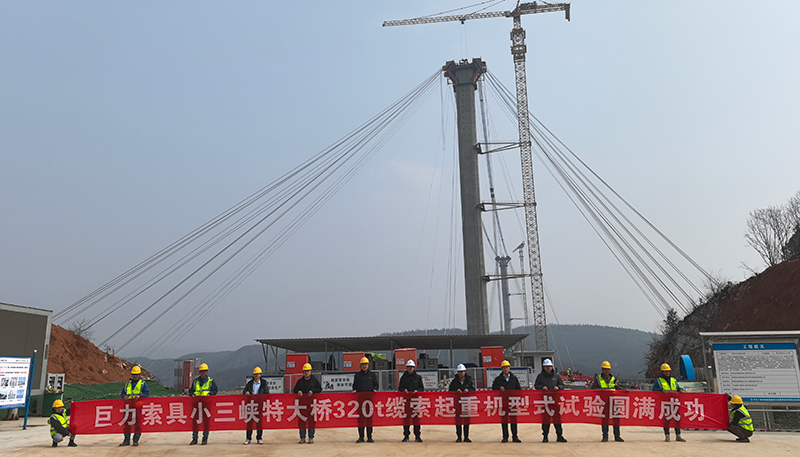 由巨力索具研發的丹江小三峽特大橋纜索起重機系統順利完成安裝調試,成功完成首節鋼箱梁吊裝,標志著這一國家重點橋梁工程邁入主體施工的關鍵階段。