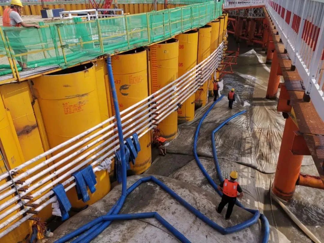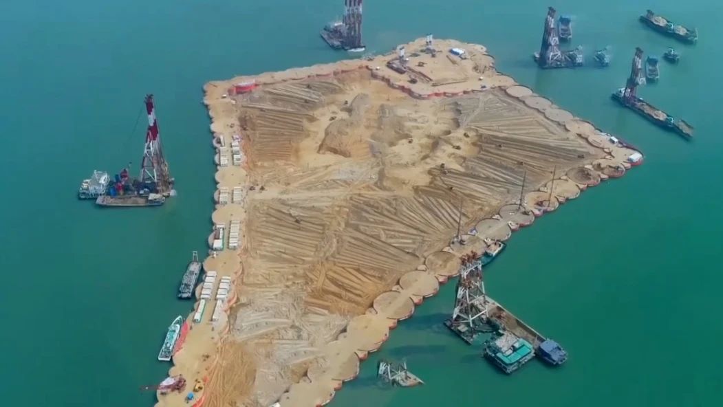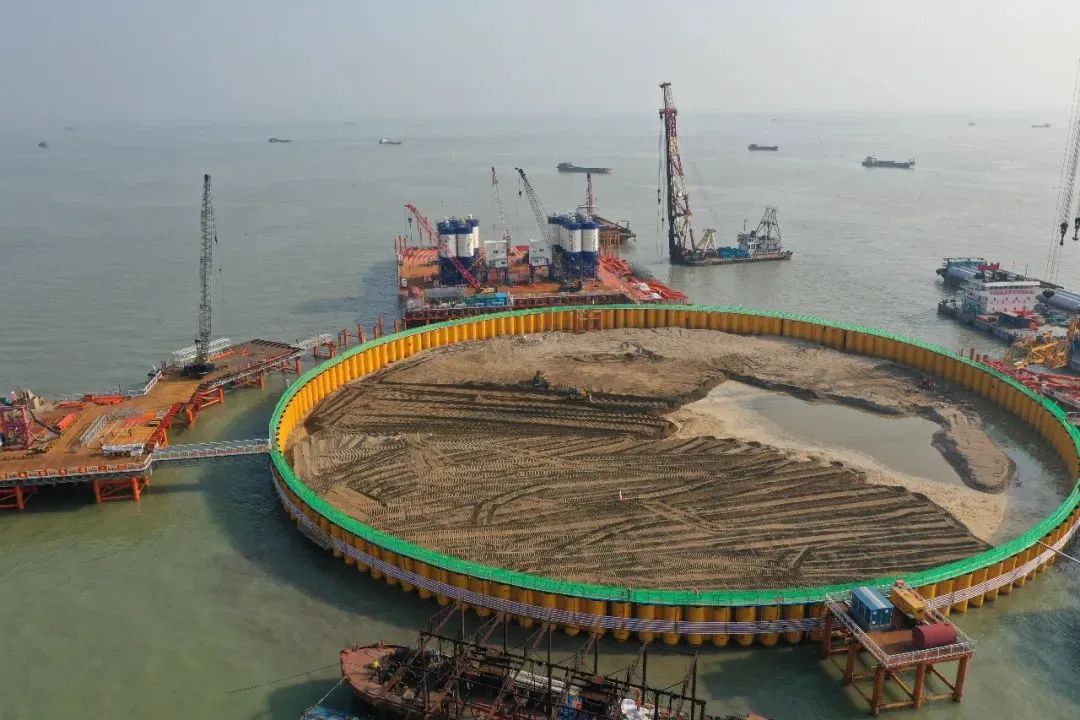 2017年9月18日,隨著最后一根鋼圓筒振沉到位,57個鋼圓筒,每個直徑28米、高35-40米,重達650噸全部精準牢固地打入海底巖層中。西人工島外圈圍堰如珠玉般勾勒出“海上鯤鵬”。僅用4個半月,在寬闊的伶仃洋中間,憑空筑起一座相當于19個足球場大小的人工島,刷新了快速成島的世界紀錄。如今,這座“海上鯤鵬”已成為伶仃洋上的新地標。從這里往東,深中通道開始了全長6845米的海底隧道部分,不久后汽車將從這里駛向海平面之下,最深的地方將在海平面之下39米的沉管隧道中行駛。