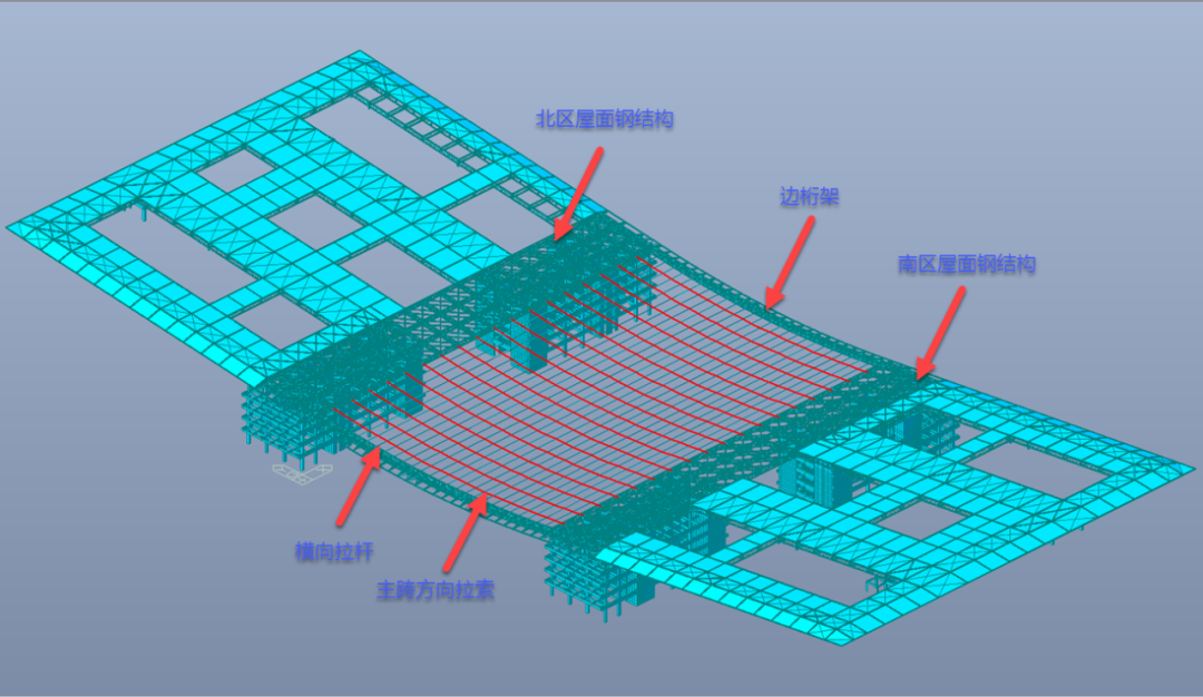 就拿高難度的拉索安裝來說,矢高約3.5米的超大弧形懸索鋼屋蓋,每榀桁架起吊后,需要找到最適宜的角度做成傾斜狀態(tài)。其中最長(zhǎng)的桁架,連續(xù)跨度可達(dá)120米左右。大屋面由“雙向鋼桁架+跨中拉索結(jié)構(gòu)”組成,中央?yún)^(qū)域110米全懸空的懸鏈態(tài)由兩側(cè)邊桁架及中間36根直徑為70毫米的不銹鋼拉索組成,施工牽引張拉、精度、溫度、雙索的扭曲偏轉(zhuǎn)是無可回避的難題。