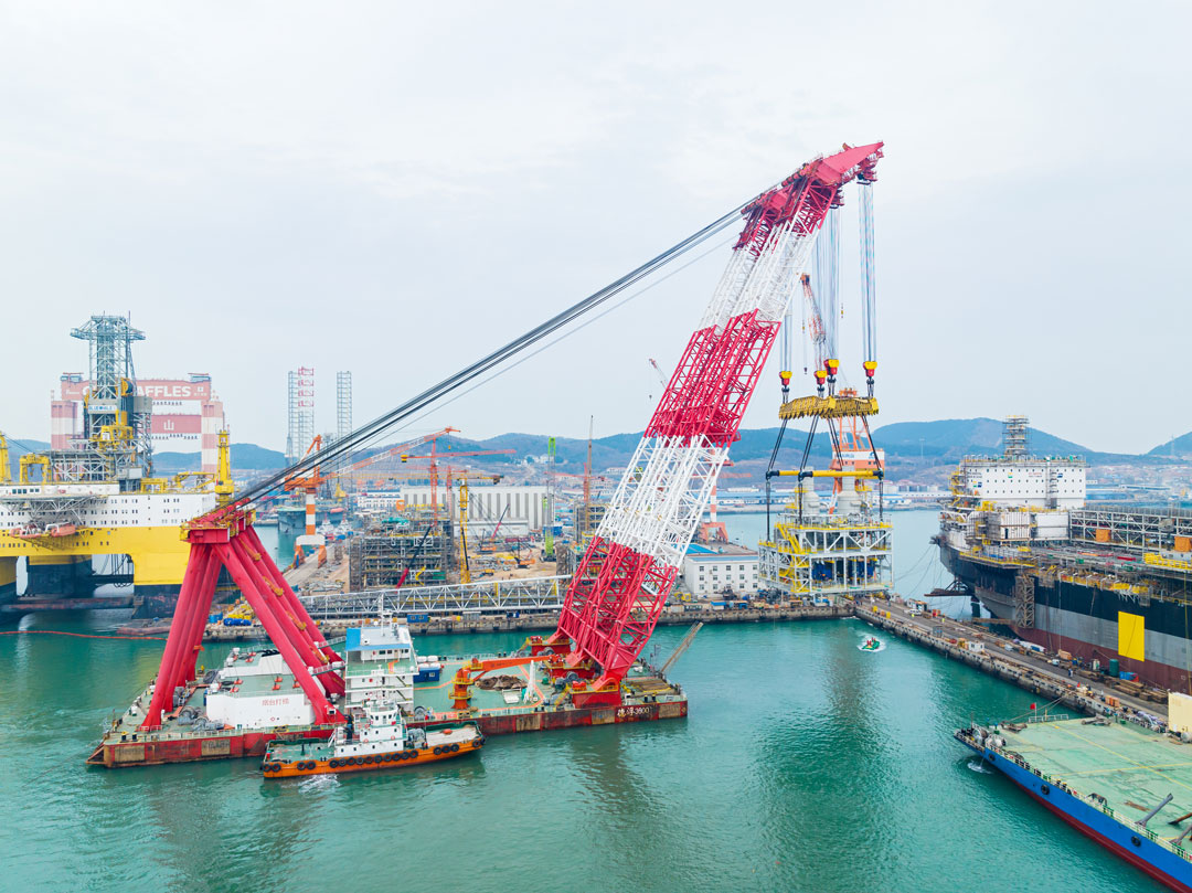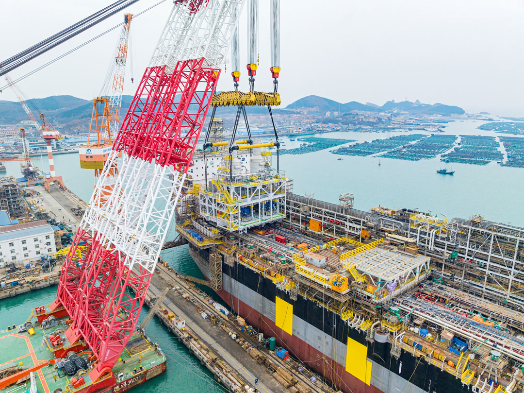 近日,中集來福士浮式生產儲油船(FPSO)重為3669噸的S20、2960噸的P60、2766噸的P20三大模塊吊裝完成。巨力索具為其提供了承載量為3000噸、2500噸的平衡梁梁式吊具、卸扣、無接頭繩索等產品,并為保證吊裝的順利進行制訂了嚴謹的吊裝方案。