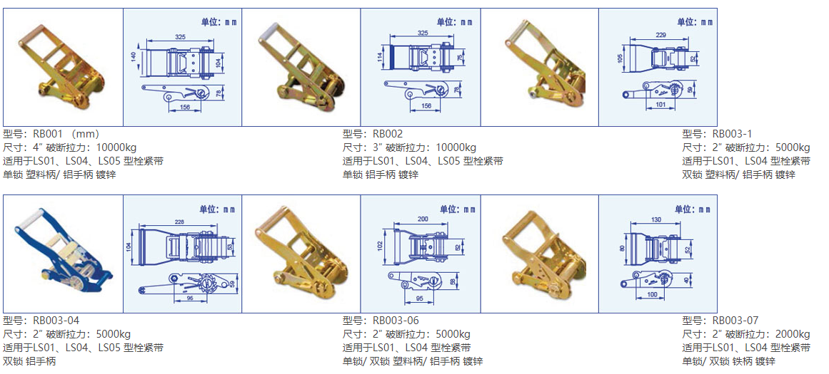 | 產品型號 | 適用尺寸 | 破斷拉力(kg) | 規格大小(mm) | 表 面 | 適合型號 | |||